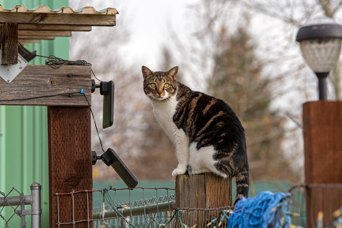 Kermit seems to just suddenly appear just about anywhere on the grounds. He often seems intent on irritating the dogs from whatever vantage point he has assumed. But, as with many cats, he affects an inscrutable air that leaves us wondering about his true motives.